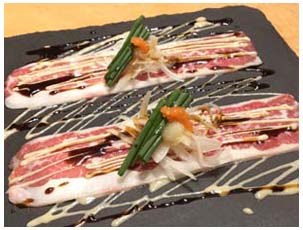 バラの一部でサシが入り甘みのある部位です。刺し身以外では、しゃぶしゃぶ用、すき焼きようとして出される高級食材です。